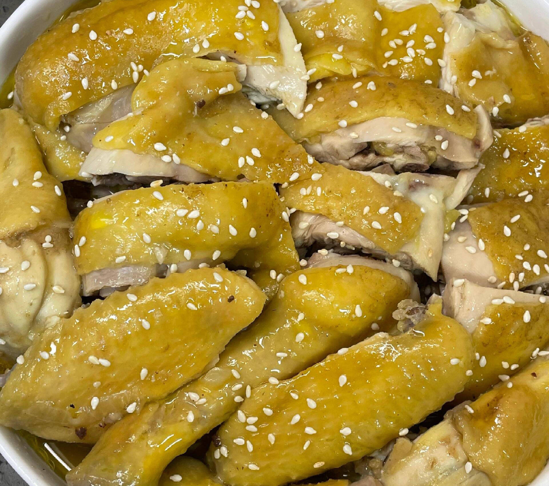 4、取出放凉后斩件摆盘,并淋上蒸鸡过程中收集到的自然鸡汤汁,最后撒上炒香的白芝麻作为点缀即可食用。