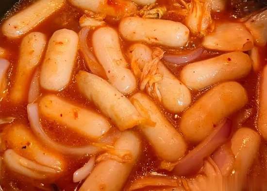 - 炒至年糕变软,洋葱熟透即可。