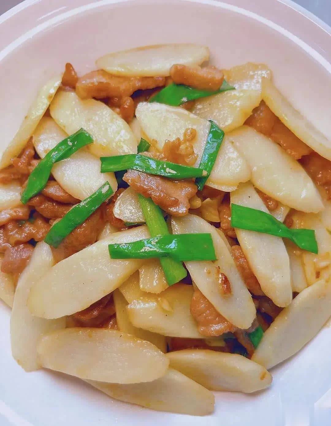 3、锅中留底油,放入焯好的山药翻炒1分钟,加入肉片和葱段,加少许盐调味翻拌均匀即可。