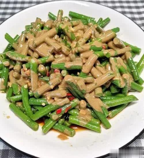 3、将酱汁浇在豆角上,搅拌均匀即可食用。