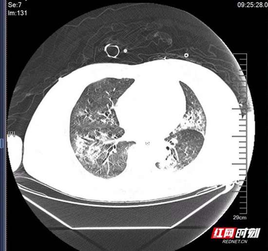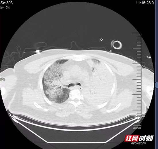 患者刘某(化名)因突发高热、呼吸急促,于外院治疗两天后病情加重,被紧急转入郴州市第四人民医院重症医学科。经无创呼吸机辅助通气,其缺氧症状仍未改善,血氧饱和度持续下降,主管医生立即进行气管插管,改为有创机械通气,并完成CT检查。结果显示,患者左肺实变,右肺亦存在大面积病灶,残留肺功能不足三分之一,确诊为重症肺炎合并重度ARDS、呼吸衰竭。