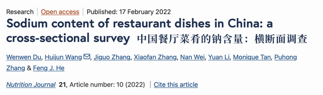 ①Sodium content of restaurant dishes in China: a cross-sectional survey.Nutrition Journal.2022.