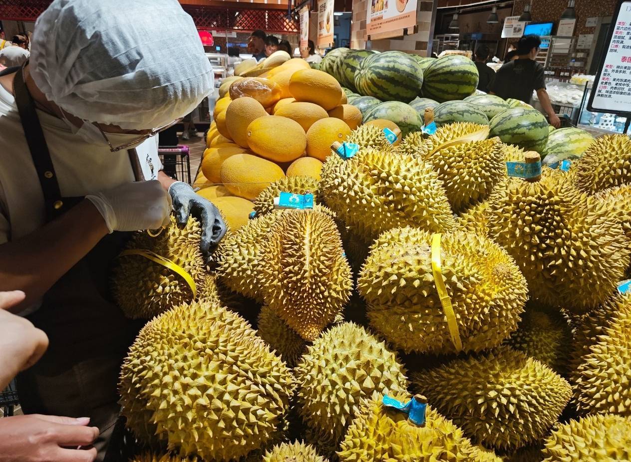 对于榴莲、草莓的售卖情况,该工作人员也介绍道:“一般来讲,榴莲的出肉率都是有保障的。但如果顾客在购买榴莲时,真的觉得不满意,胖东来也会现场退换的。目前榴莲销售紧俏,本店上午的猫山王榴莲已售罄,只有泰国金枕榴莲,前者单价70多一斤,整颗大概两三百元,后者单价40多一斤,但个头较大,整颗也有200元左右。”