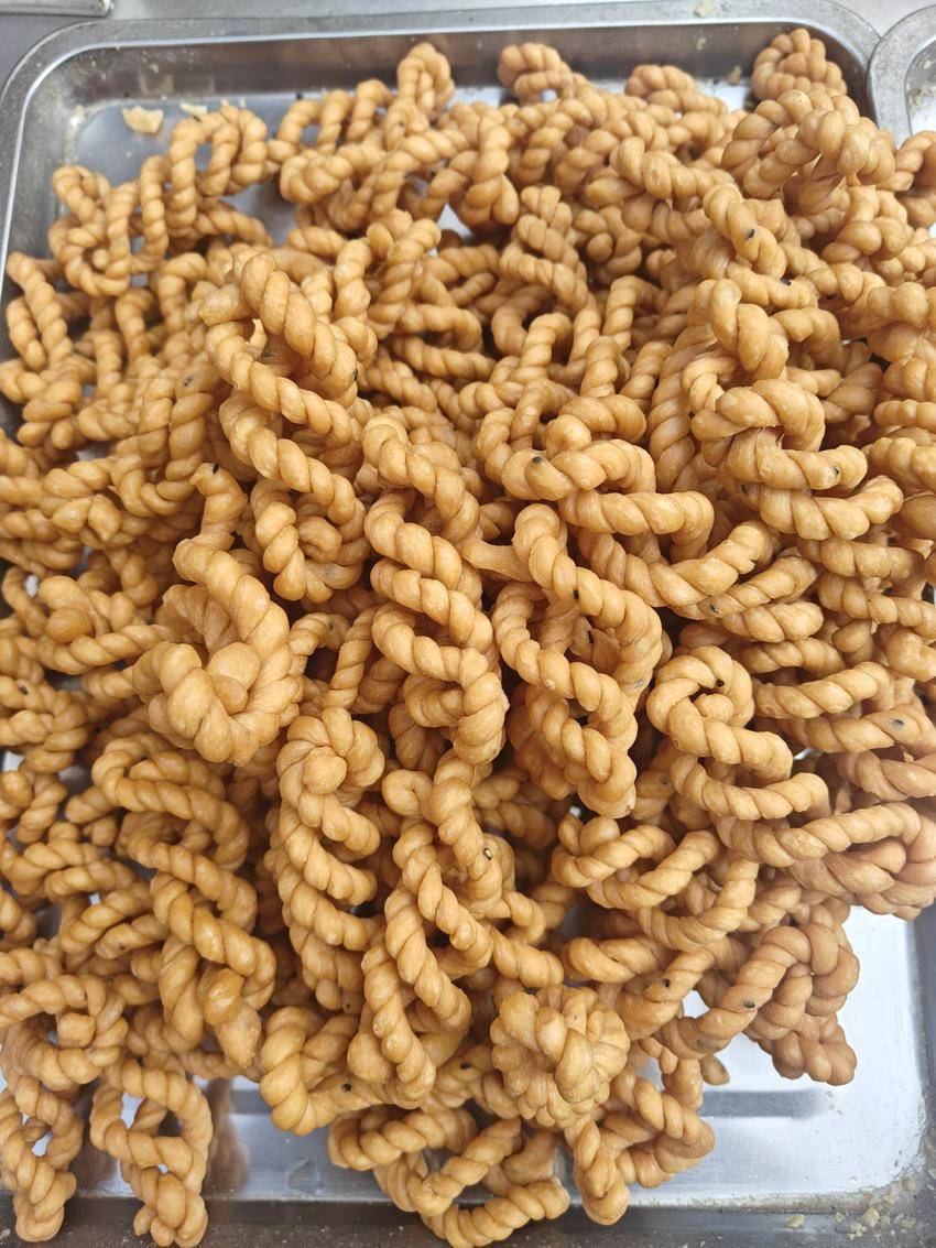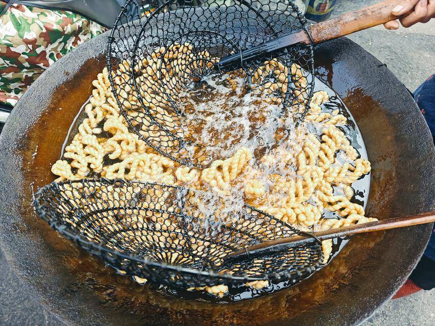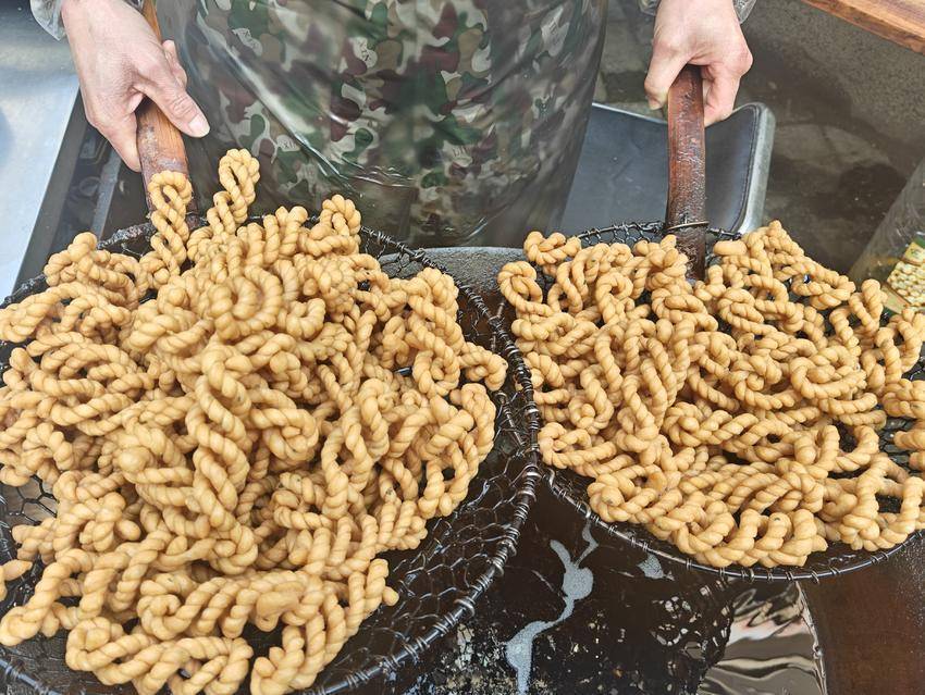 炸好的麻花要晾凉,凉透后更显酥脆。孩子们忍不住先抓起一根麻花塞进嘴里,酥渣掉了满身也顾不上拍,含糊着喊“好吃”;大人们则细心地将麻花分装成小袋,预备着走亲访友时当伴手礼。“这麻花看着简单,却是我们过年每年都要预备的美味。”村民们说,一根麻花拧着的不仅是面团,更是邻里情、家人心,越拧越紧,越嚼越香。