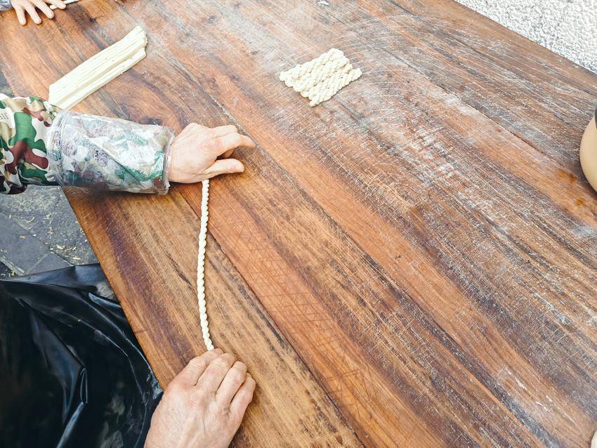 以前在杨店镇,炸麻花是过年必备的“仪式感”。腊月一到,各村就响起了油锅声。村民们不兴单独忙活,总爱几家合伙:你家出的面粉、我家出的菜籽油、他家出的是柴火,凑在一起便是最地道的年味儿。“以前家里的条件有限,炸麻花什么的每次只炸一点,现在日子好了,提前半个多月就开始准备,除了自家吃,还要给城里的儿女、外地的亲戚寄点去。”71岁的刘大妈守着油锅,看着麻花从白变黄,再到金黄酥脆,眼里满是满足。她说,炸麻花讲究“焦香酥脆”,过程还是很繁琐,先用鸡蛋、水、花生油等材料混在一起和好面团,醒发半小时左右,分成若干份。然后,用刀将面团切成适当大小的小面片,再来擀制麻花坯子。