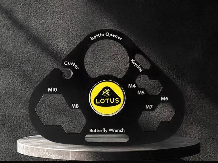 莲花汽车定制多功能扳手,是车迷专属实用周边:集M4-M10多规格扳手、开瓶器、切割器等功能于一体,小小一片便携不占空间。雅黑质感适配品牌调性,既是随车应急工具,也是彰显爱车身份的潮玩好物,实用与格调兼备。