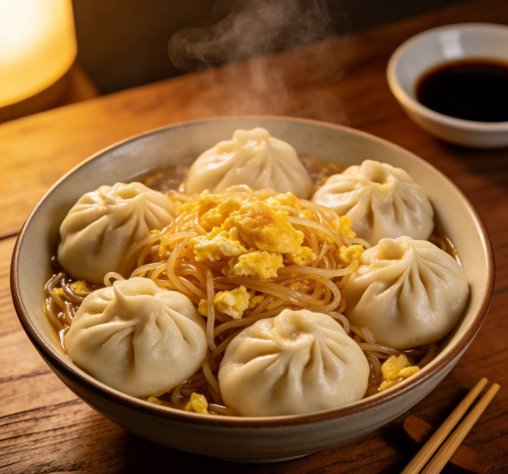调馅:粉丝泡软后切小段,加炒散的鸡蛋碎、少许葱花;放生抽1勺、盐半勺、十三香少许、香油1勺,粉丝吸满汤汁,软糯入味,老人孩子都爱吃。
