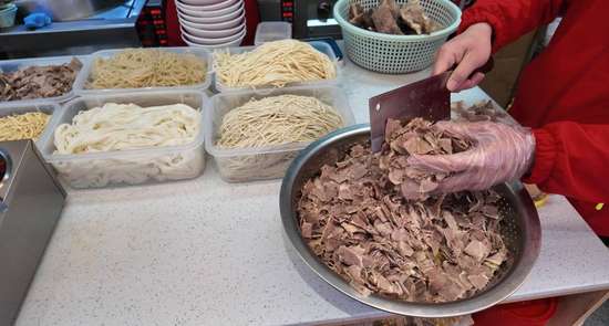 “不新鲜的骨头坚决不用,熬不够时间的汤绝不端上桌。”老板手上还沾着刚切肉的油渍,语气诚恳。在后厨,长勺舀起的汤汁奶白透亮,淋在铺满牛肉片的碗里时,肉片在热汤中微微蜷缩,配上劲道的粉条,一碗分量十足的牛肉汤便大功告成。这份对食材的较真,让汤的鲜醇、肉的软嫩成为刻在顾客味蕾上的记忆点,也成了小店最硬核的竞争力。