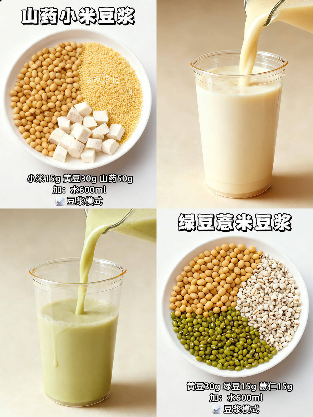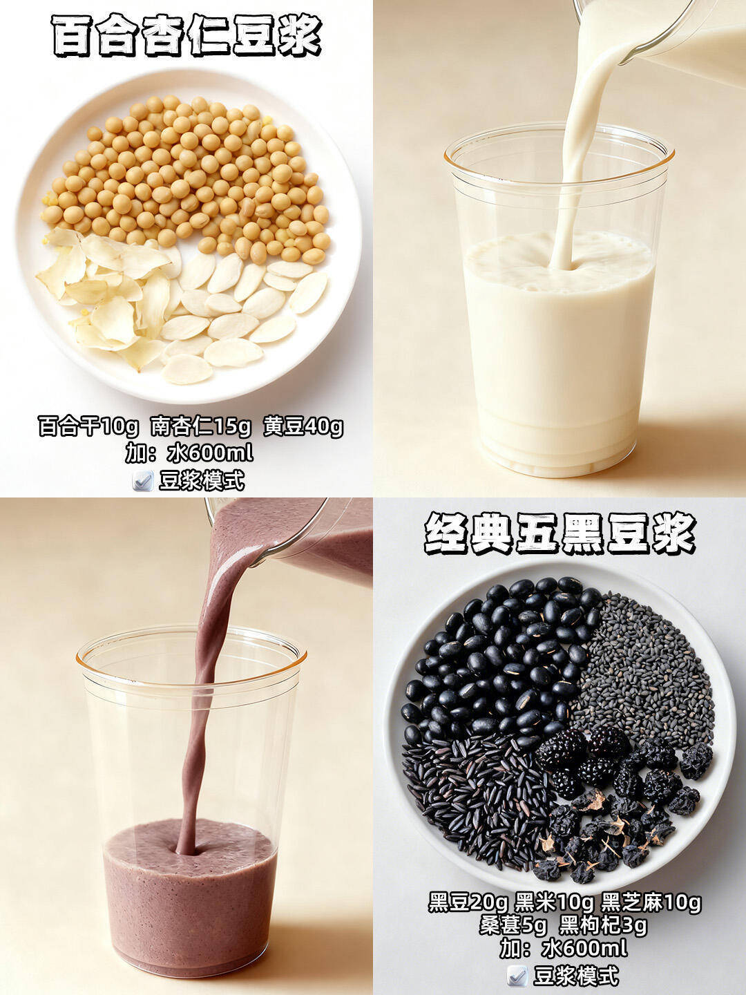 做法统一,将食材洗净后放入破壁机,加入600 - 800ml水,开启豆浆模式,完成后即可饮用,口感绵密无渣,甜度可按需调节。