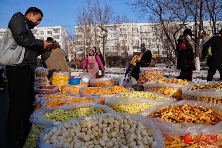 集市上,200余个摊位一字摆开,商贩们抢抓新春商机,在摊位前摆满各式年货,从生鲜果蔬到卤味熟食,从民俗饰品到实用好物,品类丰富令人目不暇接。而糖炒栗子的焦香、粘豆包的软糯、酸菜炖猪肉的醇厚等,更是勾勒出独属于东北的味觉记忆,小吃摊前人头攒动,食客排起长队,热气腾腾的美食里,盛满了人们对新年的期盼。