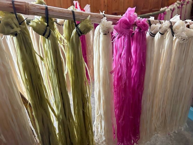 今年,田宗学为了让粉皮的寓意更加丰富,额外将火龙果汁、棉菜花及玉米粒放在泡发的米中依次打磨,制成红色米浆、绿色米浆和黄色米浆,呈现传统与创新的碰撞,让古老手艺焕发出贴合时代审美的生机。