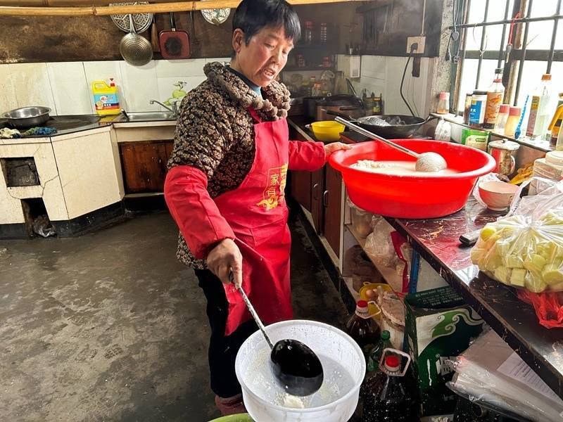 走进望城村,60岁的田宗学正在淘米,淘洗干净后放在盆子里浸泡一晚。次日清晨,她带着一家子一早将灶台烧热,屋外炊烟袅袅,屋内水汽蒸腾,大家团结协作,手上的洗盆、炒制调味料、备菜等动作一气呵成。