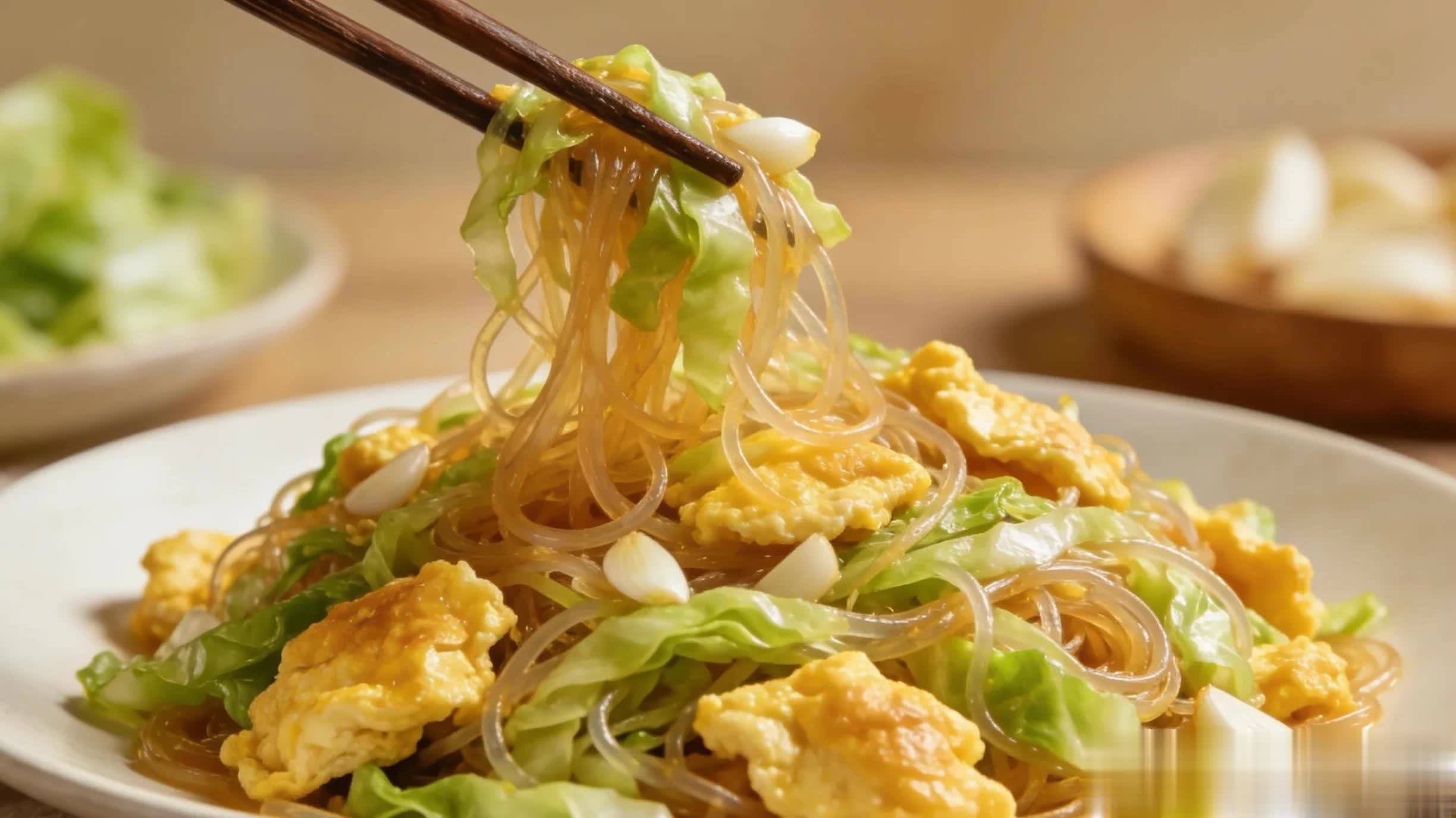 做法:鸡蛋炒熟盛出;热油炒香蒜末,下包菜丝炒软,加泡好的粉丝翻炒,放生抽、蚝油调味,最后倒入鸡蛋炒匀。