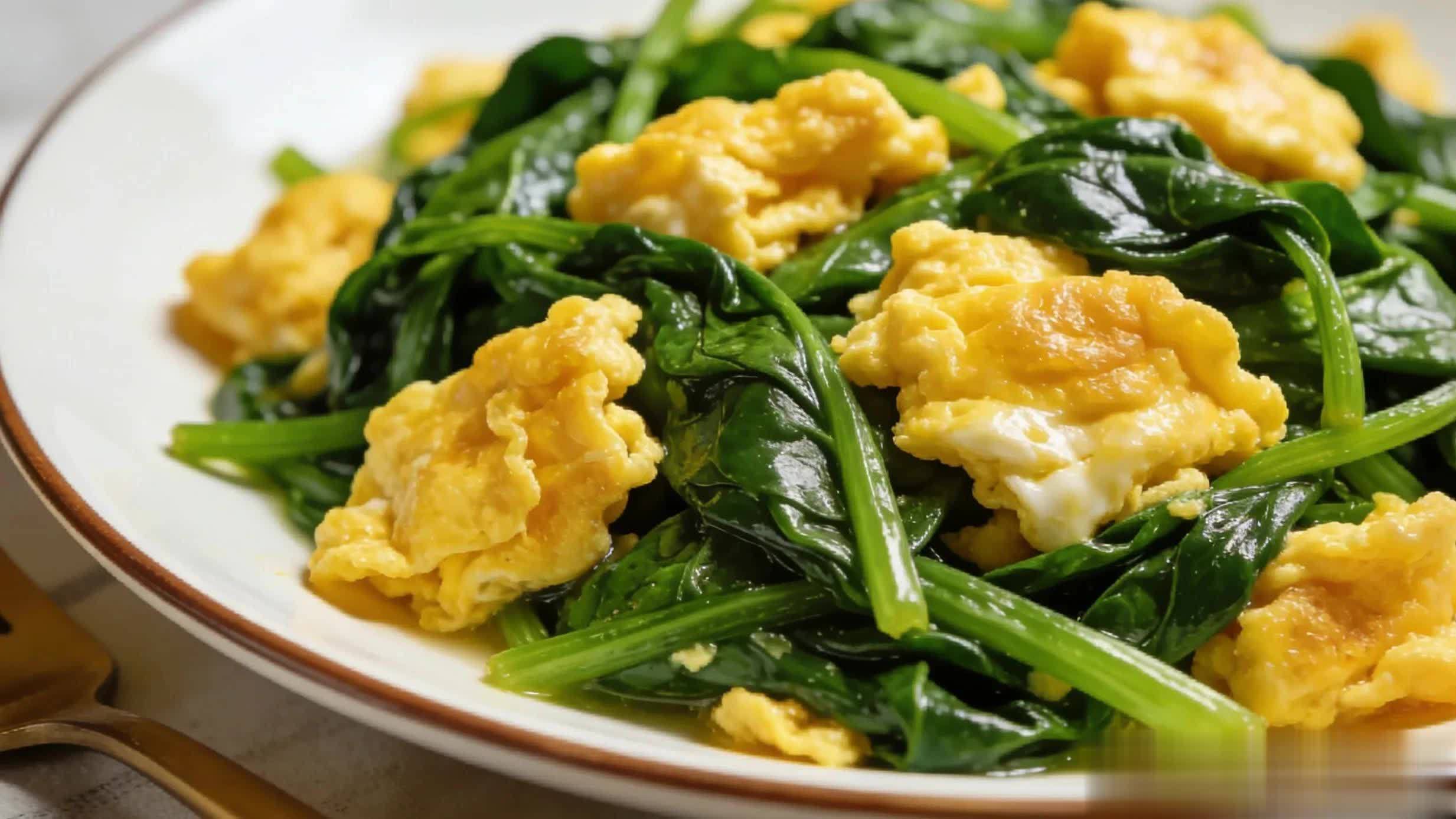 做法:菠菜焯水去草酸,鸡蛋炒熟盛出;热油炒香蒜末,下菠菜翻炒,加鸡蛋炒匀,放少许盐调味。