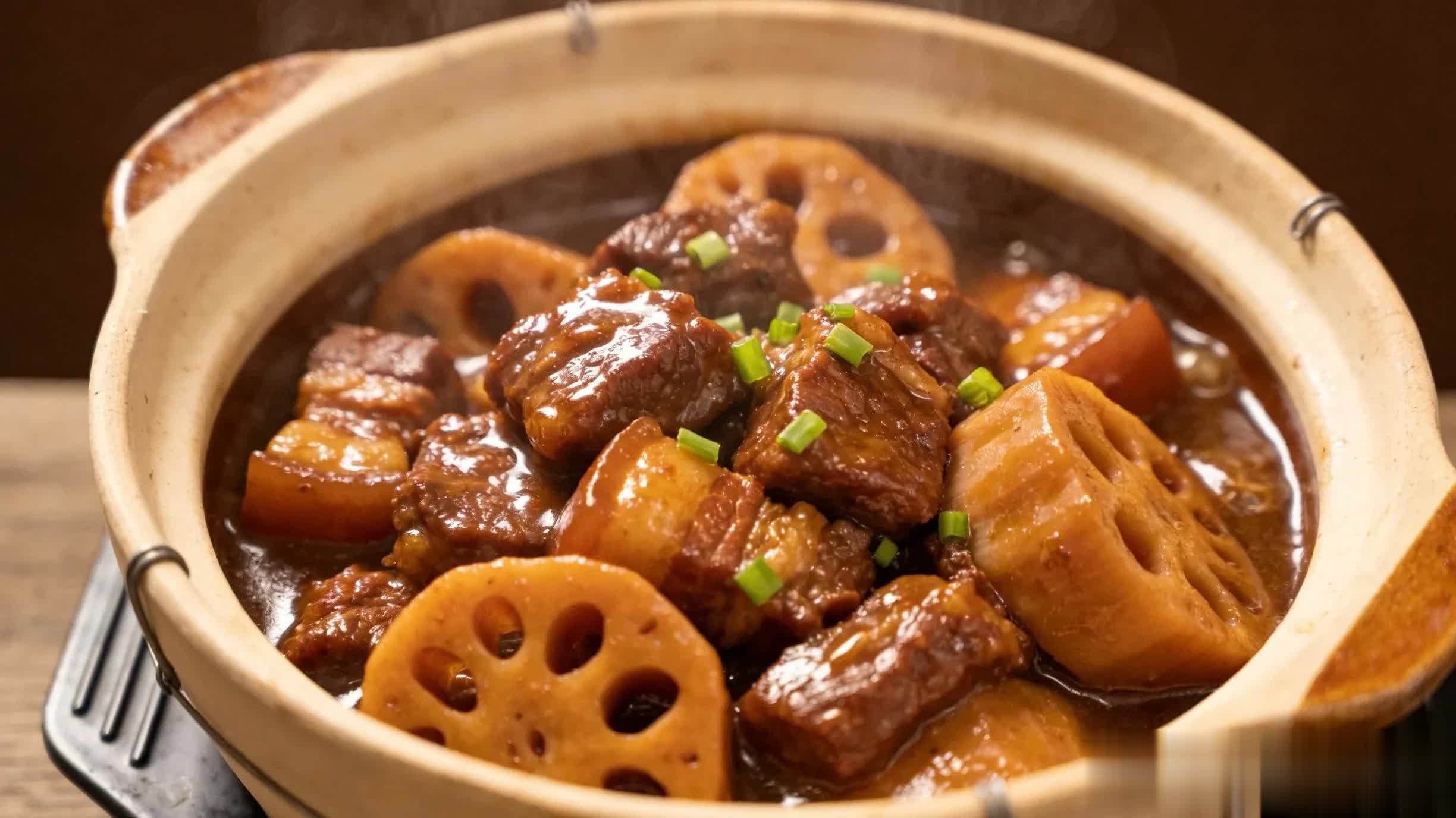 做法:梅花肉切块焯水,莲藕去皮切块;锅中倒油,下肉块炒至微黄,加葱姜、生抽、老抽翻炒,加水焖煮30分钟,放入莲藕再炖15分钟,收汁出锅。