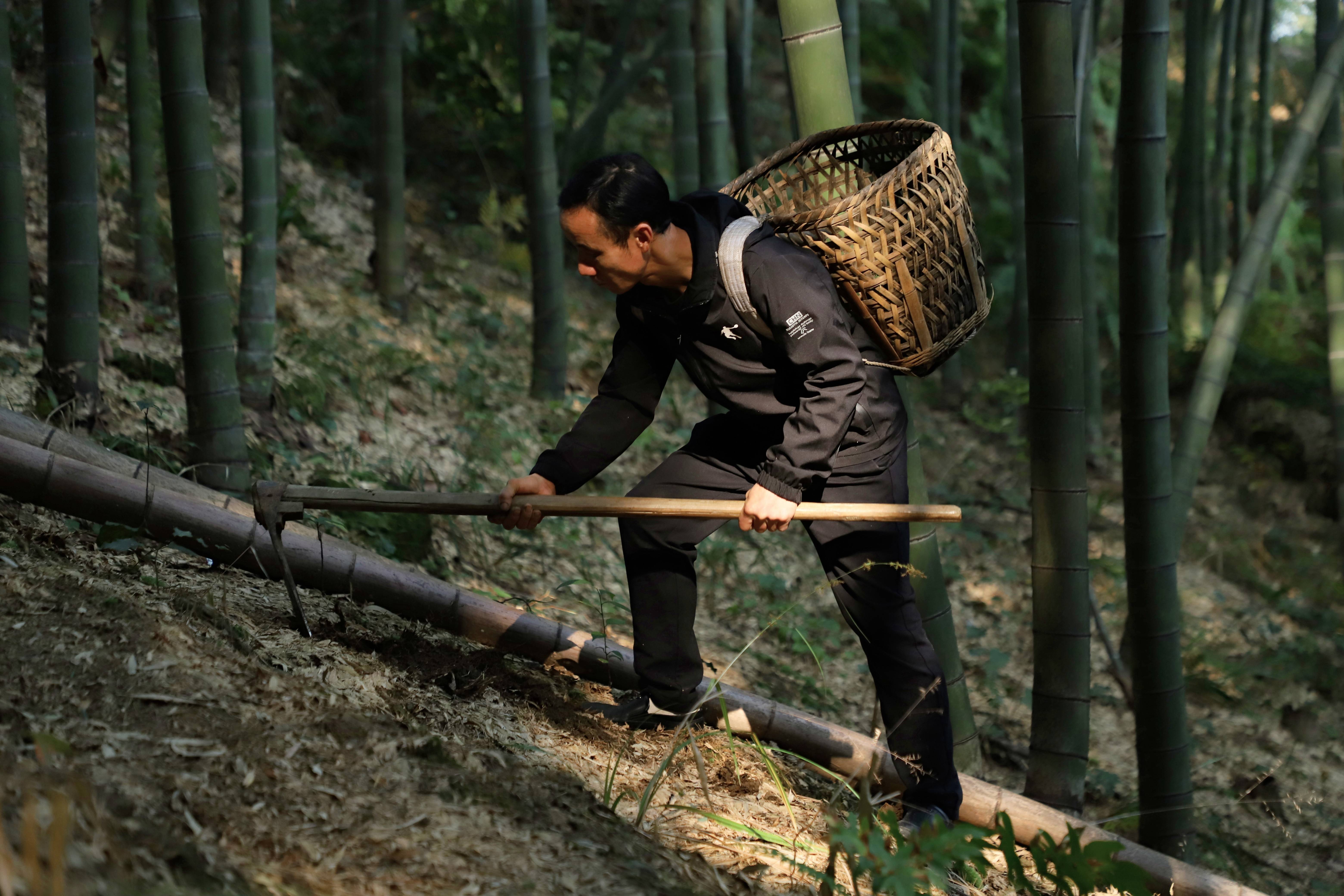 但笋究竟在哪里?记者驱车翻越丘陵、爬上海拔800米的竹山,在竹林中探索半天,也不见“笋影”。不时遇到当地老乡,背的竹编箩筐装着一块块金黄的冬笋,都是满载而归。博望村村民赵光伟得知记者来意,说笋就在地里,并慷慨地给记者借了锄头,还指了一片他们家承包的竹林,让记者随便挖,不要客气。记者在竹林中左挖一锄,右铲一下,挖得周围像是遭了土拨鼠害,仍然一无所获。原来冬笋不露尖,只能凭竹鞭走向判断位置,没有经验很难找准。在老乡指导之下,没费多少功夫,记者也终于有了收获,成功挖出了一颗又大又肥的冬笋。