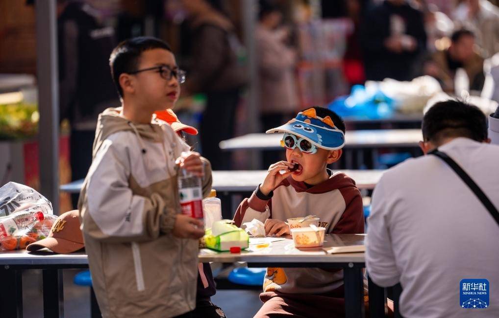 2月18日,小朋友们在昆明市官渡古镇品尝美食。