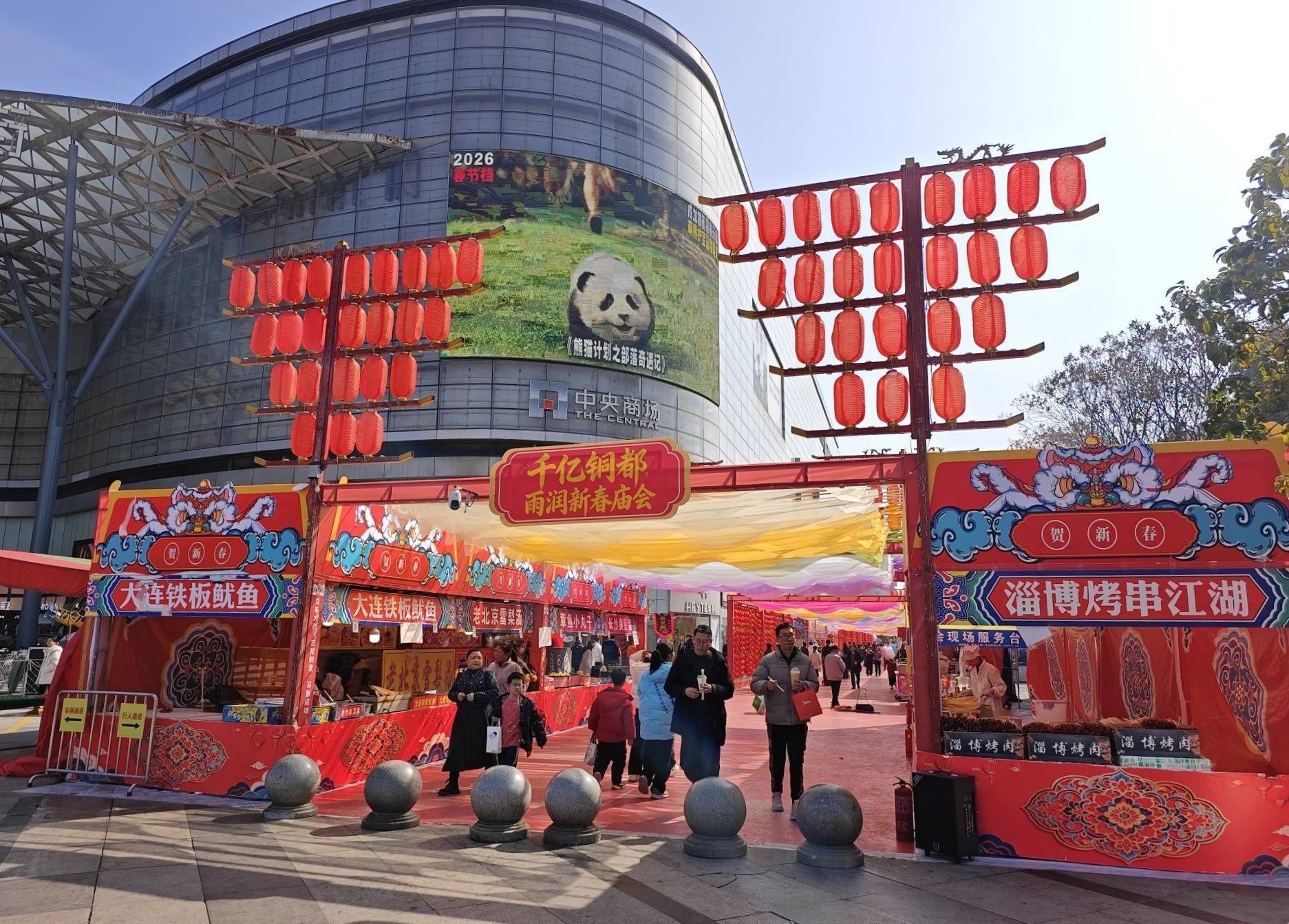 走进雨润中央商场,年货商品琳琅满目,往来市民络绎不绝。特色小吃摊位前食客云集,亲子游乐区域欢声笑语不断。