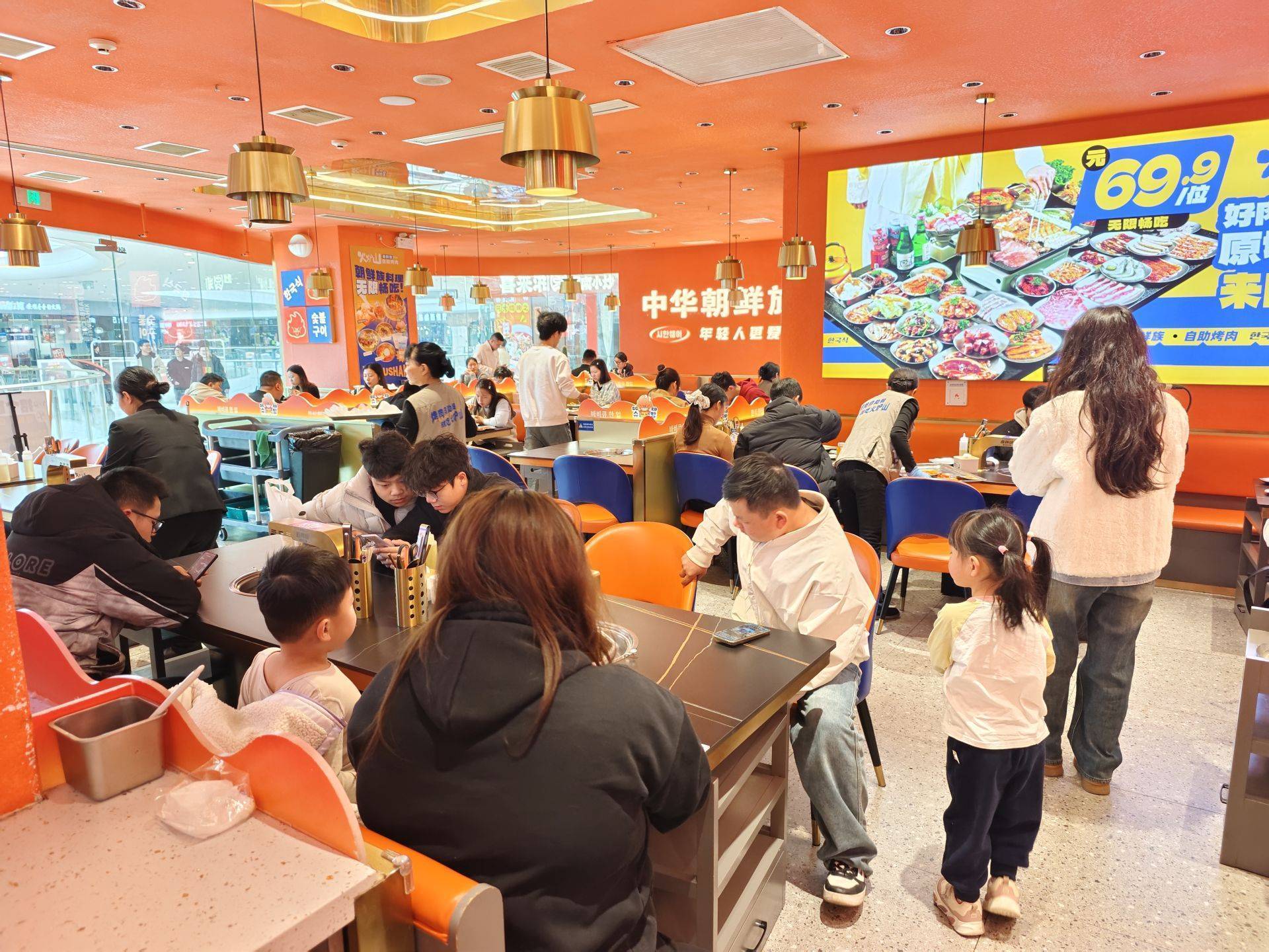餐饮消费是春节市场的“烟火担当”,吾悦广场一家自助烤肉店内座无虚席,候餐区市民有序排队,从午市到晚市满座状态持续不断。店长华钗介绍,春节期间家庭聚餐、朋友聚会订单激增,门店全程满负荷运转,通过延长营业时间、全员在岗值守,全力保障市民就餐体验。