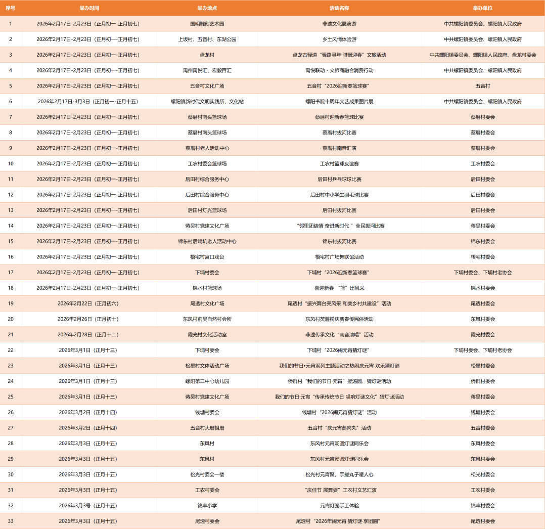 螺阳镇2026年春节元宵文旅活动汇总表