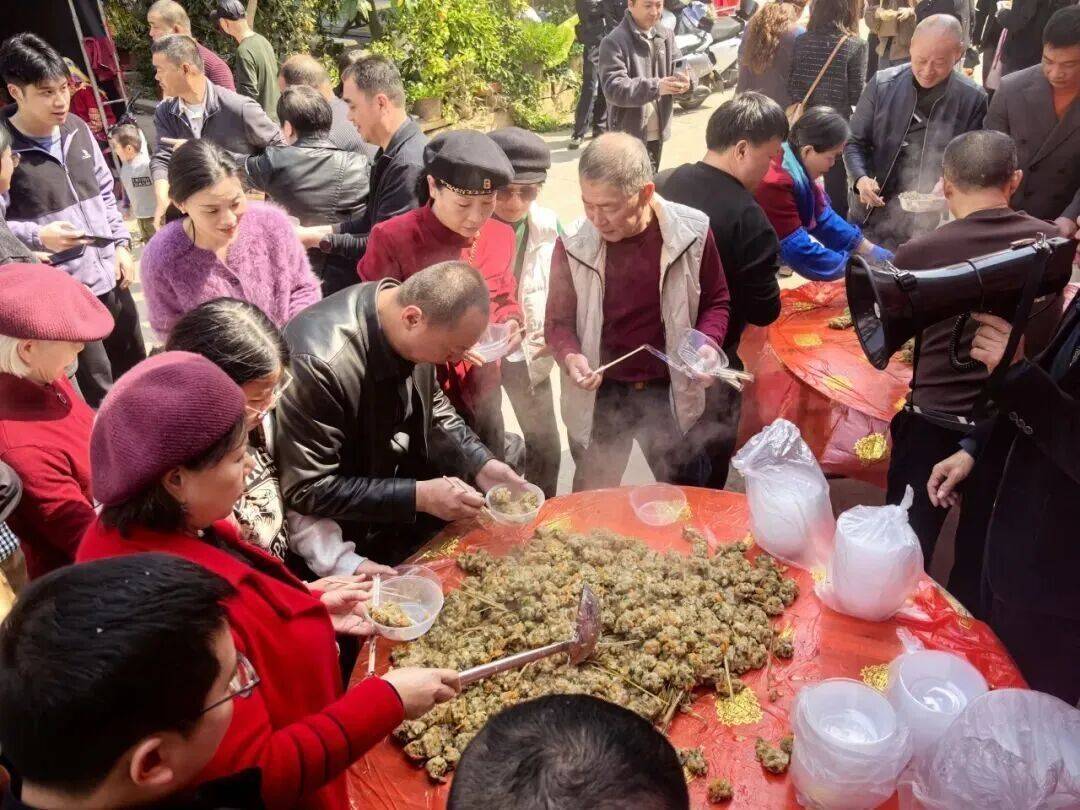 上午九时许,活动现场已是人声鼎沸,热闹非凡。只见大家分工有序,配合默契:男士们动作干脆利落,将猪肉剁得细腻均匀;妇女们熟练地清洗青葱、萝卜,沥干后切粒备用;长者们巧手翻飞,将地瓜粉与配料反复揉搓搅拌,直至团成一个个圆润饱满的肉丸;年轻人则忙着搬运蒸笼、添柴烧火。几分钟后,数十口蒸笼同时升起腾腾热气,场面热烈,那股熟悉的“乡愁”味道瞬间在空气中弥漫开来。