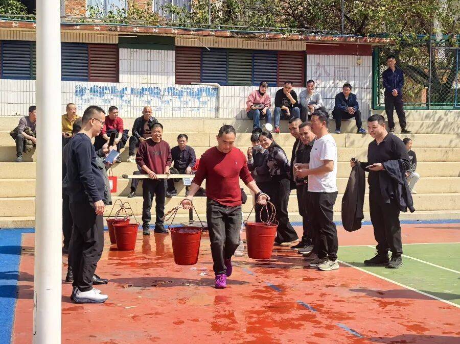 在球场另一侧,一场别开生面的“农民挑水过田岸”比赛正在激烈进行。参赛者们肩挑满载清水的扁担,在跑道上健步如飞,既要保证速度,又要确保桶中水不洒落。这不仅是对传统农耕生活的致敬,更引得围观群众加油声、欢笑声此起彼伏,将新春的喜庆氛围推向高潮。