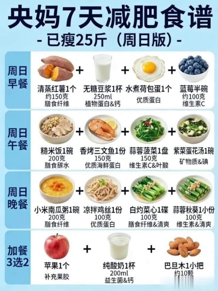 - 早餐:清蒸红薯150g + 无糖豆浆250ml + 水煮荷包蛋1个 + 蓝莓100g