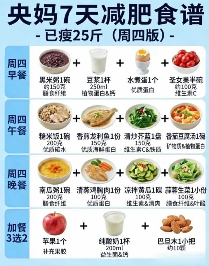 - 加餐(3选2):苹果1个 / 纯酸奶200ml / 巴旦木1小把