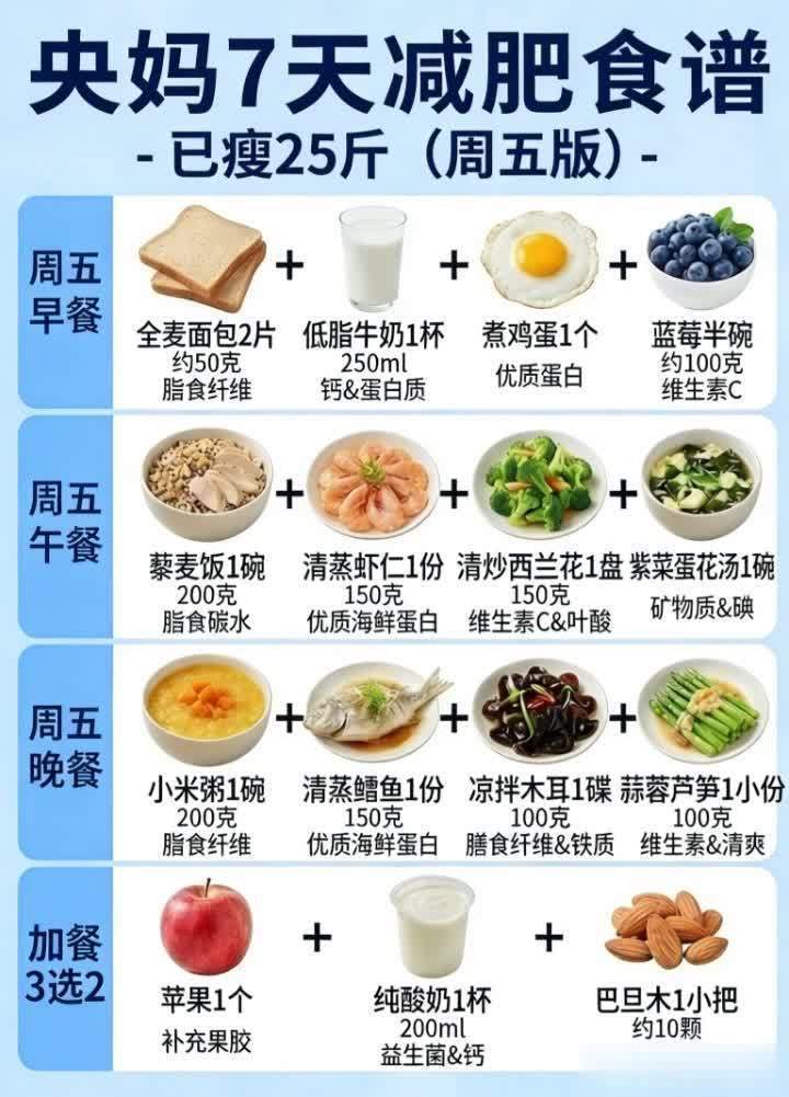 - 午餐:藜麦饭200g + 清蒸虾仁150g + 清炒西兰花150g + 紫菜蛋花汤1碗