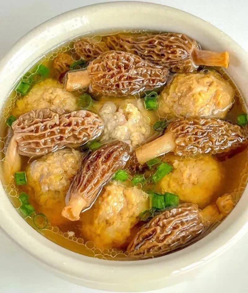 食材:羊肚菌、猪梅花肉、红薯淀粉、盐、食用油、香菜/葱花