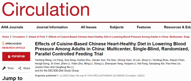 ①Effects of Cuisine-Based Chinese Heart-Healthy Diet in Lowering Blood Pressure Among Adults in China:Multicenter,Single-Blind,Randomized,Parallel Controlled Feeding Trial.Circulation,July 11,2022.
