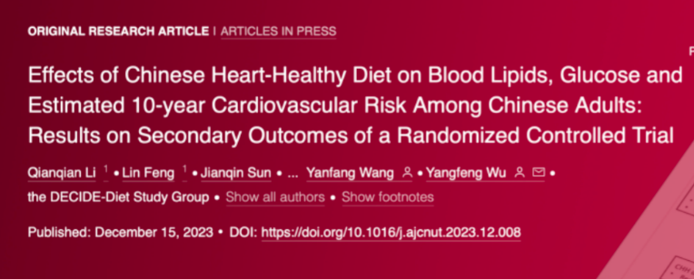 ②Effects of Chinese Heart-Healthy Diet on Blood Lipids, Glucose and Estimated 10-year Cardiovascular Risk Among Chinese Adults: Results on Secondary Outcomes of a Randomized Controlled Trial. Am J Clin Nutr, December 15, 2023