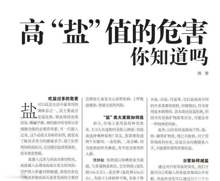 [1]闵芳.高“盐”值的危害你知道吗[J].生命与灾害,2021,(10):38-39.