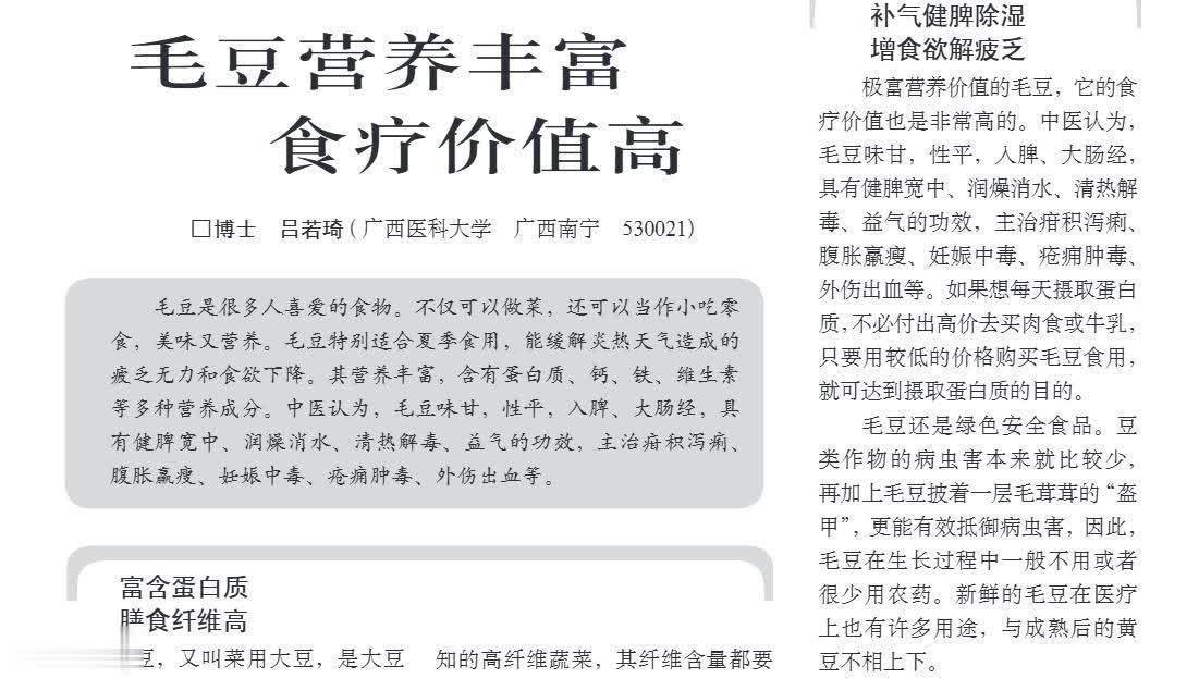 补充优质营养,助力身体健康。毛豆之所以被称为健康食物,首先是因为它富含丰富的营养成分。毛豆富含极高的蛋白质,其所含植物蛋白十分利于人体吸收。