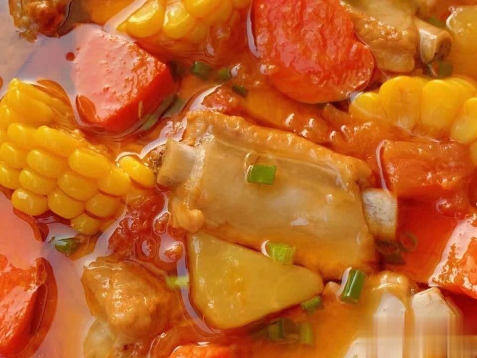 2.胡萝卜去皮,然后和甜玉米一起清洗好,接着分别切小块放入炖锅中,再把番茄也清洗干净,也切成小块一起放入。