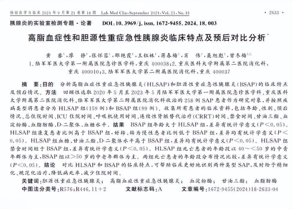 黄睿.高脂血症性和胆源性重症急性胰腺炎临床特点及预后对比分析, 检验医学与临床 ,2024-09-26