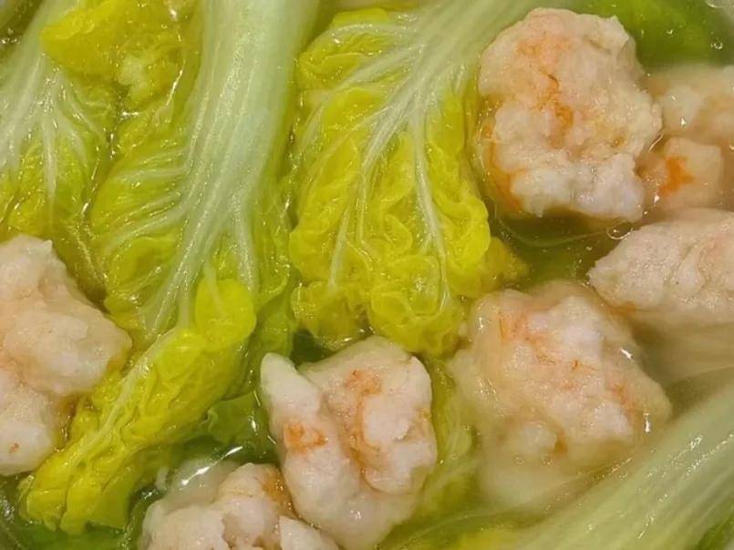 3、炒软娃娃菜后,再往里加入适量的清水大火煮开,然后加入虾球一起煮熟。