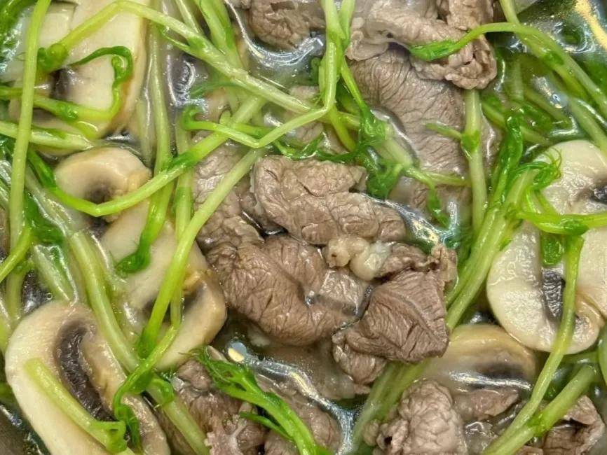准备食材: 牛肉、口蘑、豆苗、姜丝。
