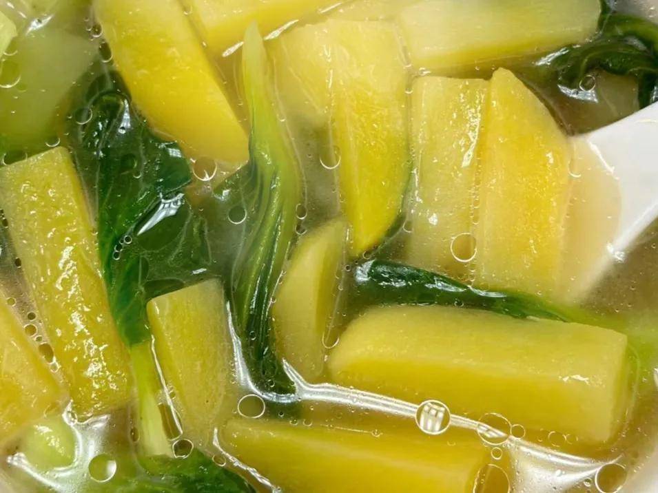 3、然后加入小白菜一起煮熟,然后往里加入适量的食盐调味,即可出锅开吃。