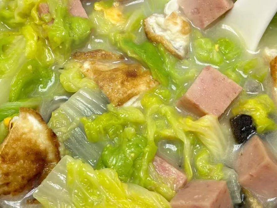 一上汤白菜准备食材大白菜皮蛋午餐肉鸡蛋姜丝。做法步骤1清洗干净大白菜切小段,接着热锅烧油,油热以后,往里打入两个鸡蛋油煎,煎熟鸡蛋后,再盛出切小块备用。2切好皮蛋和午餐肉,接着热锅烧油,油热以后,放入皮蛋和午餐肉煸炒。3煸炒出香味后后,再加入适量的清水大火煮开,接着加入煎好的鸡蛋和白菜一起煮两分钟煮
