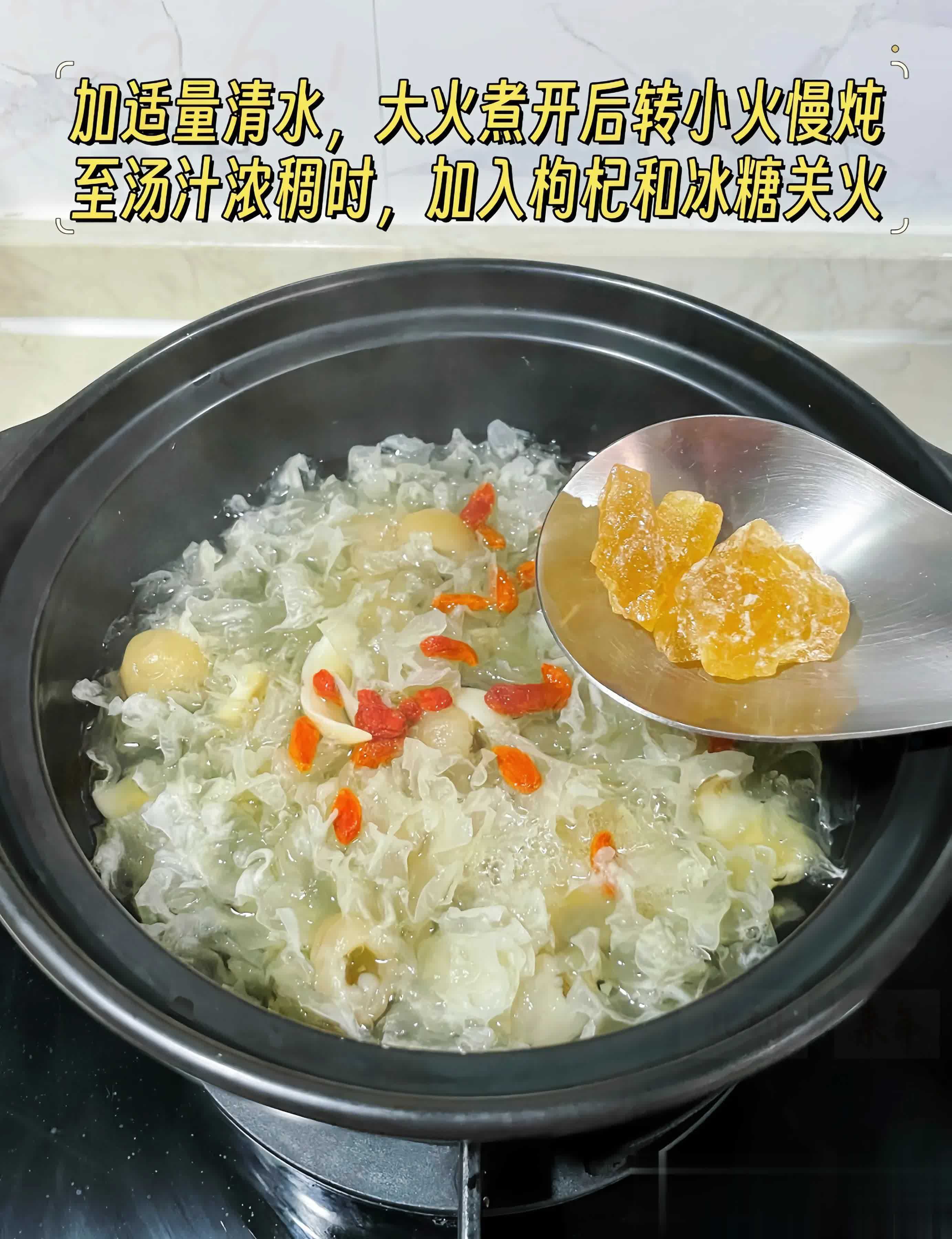 将银耳、桂圆肉、百合一同放入砂锅中,加适量清水,大火煮开后转小火慢炖至汤汁浓稠时,加入枸杞和冰糖关火