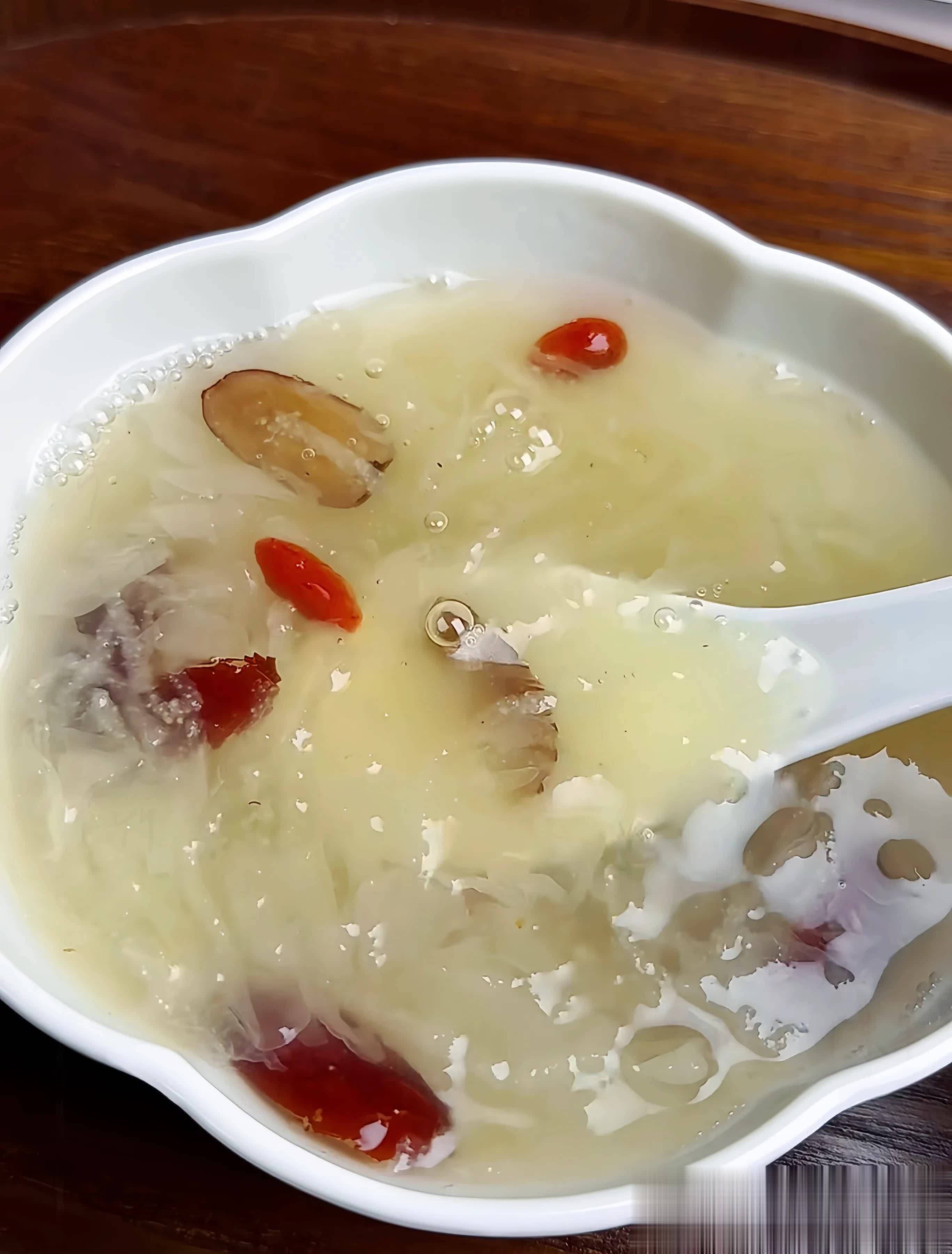 一雪梨鸡头米银耳羹食材银耳雪梨鸡头米玉竹枸杞冰糖清水。做法银耳提前泡个15分钟,软了就剪小块备用。锅里放玉竹和冰糖,来点清水,大火煮40分钟,中途别忘了盖盖子焖一会儿。接着下雪梨块,继续煮个10分钟,梨的清甜会让汤更润嘴。最后放鸡头米和枸杞,再煮5分钟就好了。鸡头米泡透了,口感软糯,和银耳融合,好喝