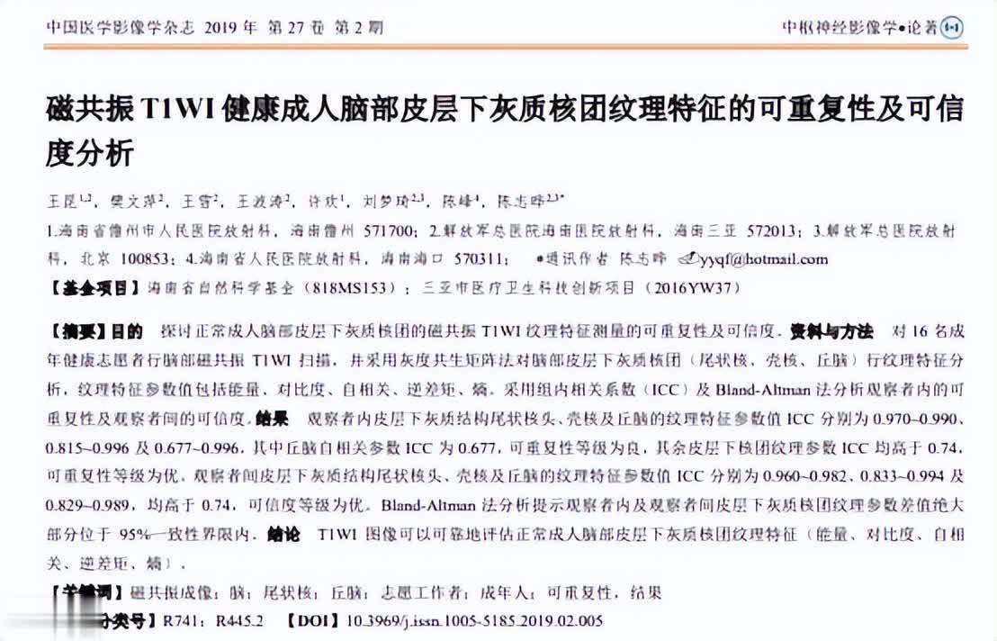 [1]王昆,樊文萍,王雪,王波涛,许欢,刘梦琦,陈峰,陈志晔,磁共振 T1WI 健康成人脑部皮层下灰质核团纹理特征的可重复性及可信度分析,中国医学影像学杂志,2019-02-25